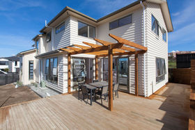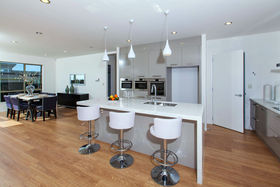 A grand entrance, wide passageway, high stud, quality tiles all impact on the buyer entering this really sunny, light 5 bedroom brand new weatherboard home. Being close to the new shops to be built, commanding an elevated position in the street and subdivision, with no other homes for sale in this garden street all add up to make this a very popular and sought after home. Even the northern neighbour has single level type home and has no windows opening onto this home further enhancing the privacy aspect and also allowing a lot more sunlight to fill the home. The large north facing deck has easy access flowing from open plan gourmet kitchen dining & family room. The kitchen has around the corner another kitchenette containing another sink plus gas hob for heavy cooking. The main kitchen has an induction hotplate plus no less than microwave oven, steam oven and good sized Bosch oven, all placed around eye level for easy cooking. Well spec'd upmarket home, even has water temperature control.