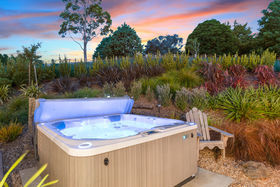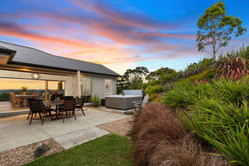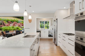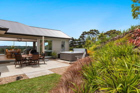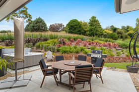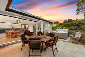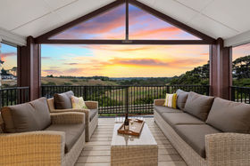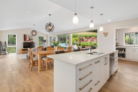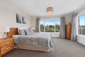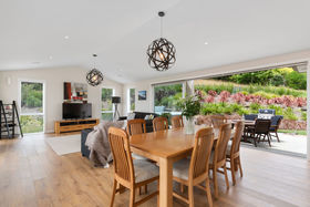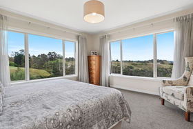 The home features a modern open plan kitchen with an impressive central island and large scullery perfect for entertaining family and friends. The dining area and family room are bordered by large sliding glass doors on either side that open out to a level patio, lawns and spa pool on one side and a large covered balcony with expansive scenic countryside views on the other.