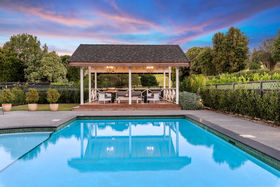 Resort style outdoor pool area with large In-ground swimming pool and cabana providing shade for those long summer days enjoying time with the family.
