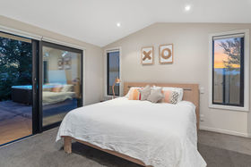 The main home features 4 large sliding glass doors that retract right back to reveal a designer kitchen with open plan dining and large family living area that flow seamlessly to the outdoors. There are 5 bedrooms in total, master with large walk-in robe, ensuite and access to a private back deck that also includes a spa pool. The triple car garage has enough space to store all of the toys and houses the distinctive cedar battened pod on the second story which includes the fifth bedroom, toilet and storage area.